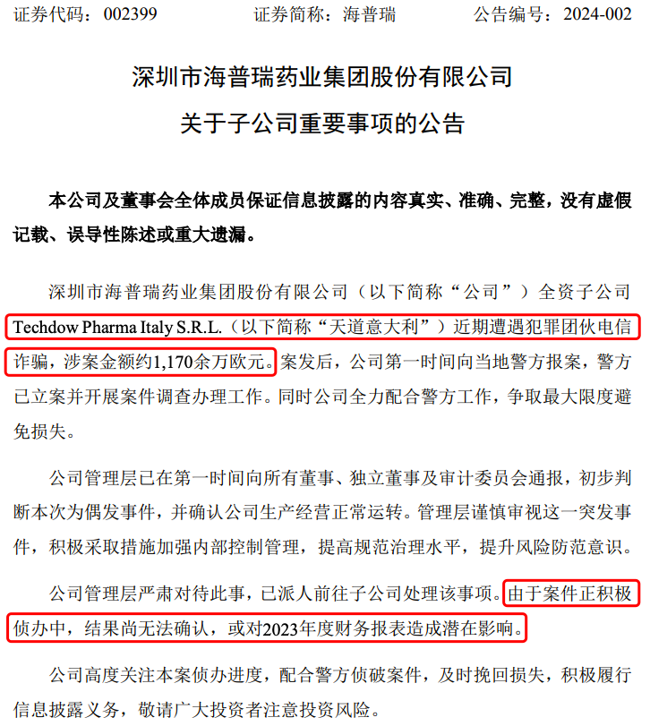 1月14日晚间,海普瑞发布公告称,其全资子公司Techdow Pharma Italy S.R.L.(以下简称“天道意大利”)近期遭遇犯罪团伙电信诈骗,涉案金额约1170余万欧元(约合人民币9196万元)。