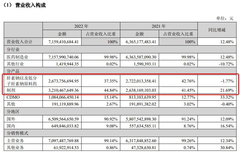 肝素原料作为海普瑞的传统业务,也是公司曾经的营收支柱,但在2022年这一格局发生变化——制剂收入32.10亿元,占比44.84%,肝素原料药收入26.74亿元,占比37.35%。