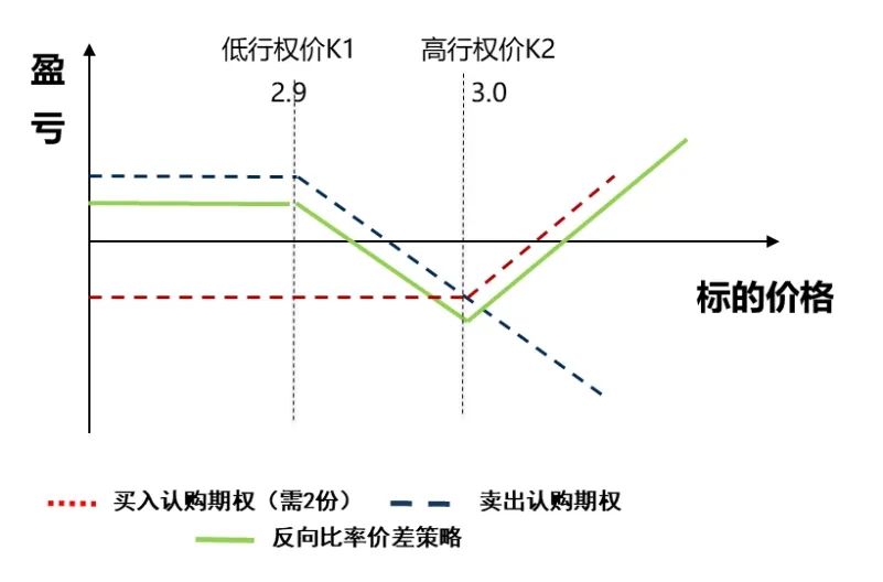 此外,与比率认购价差策略类似,反向比率认购策略可以通过比率调整,理论上构建反向比率认购策略只需买x张认购期权,卖y张认购期权,且x大于y即可,但是y越小则整个策略组合越接近于买认购的单腿策略,y越接近x则整个策略组合越接近熊市价差策略,x和y的比率大小最终决定了整个组合的Delta大小,2:1是较为常见的仓位比例。