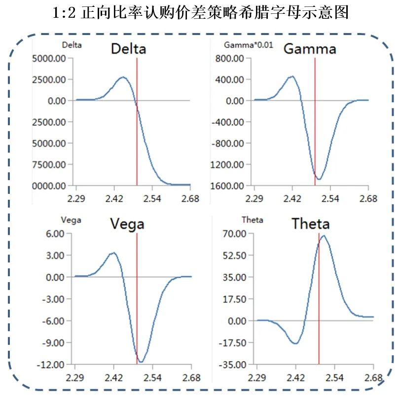 此外,在控制好组合策略的Theta的前提下,比率价差策略的Delta取决于行权价价差。像在比率认购价差策略中,投资者卖出的合约张数比买入的合约张数要多,通常是看空Delta。从理论上来看,义务仓和权利仓的张数可能有无数种组合,也就是比率(反向比率)的数值有无数种可能的大小,但是比值越接近1就意味着策略组合越接近牛市/熊市价差。