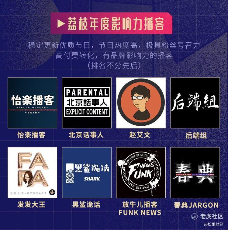 此外,去年年度品质播客则评选出了大内密谈、电影不无聊、三好坏男孩、糖蒜广播、洪晃|晃然大悟等48档优质播客,更有荔枝年度新锐播客、荔枝年度潜力播客等奖项同步发布。