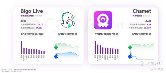 社交依然是人们冲浪的主要需求之一,而直播和1V1视频社交则是海外社交应用的热门赛道;Bigo Live和Chamet都是2023年的投放王者,其中前者主要目标欧美市场,后者则更偏向于中东和南美市场。