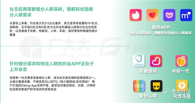 社交应用需要对细分人群深耕,理解和创造细分人群需求。从营收上来看,约会类大约2/3占比最多,其次是秀场直播和1V1社交、语聊房、元宇宙AI社交和K歌;在大众约会的基础上逐渐衍生出女性友好,以及垂直于宗教、性取向、人种、年龄、身材等各种维度的细分赛道。
