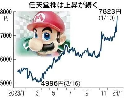 2023年最后一个交易日,任天堂股价达到7359日元/股,刷新了16年来最高记录。全年股价涨幅33.03%,市值达到9.56万亿日元,市盈率18.09%,过去5年累涨162.54%。