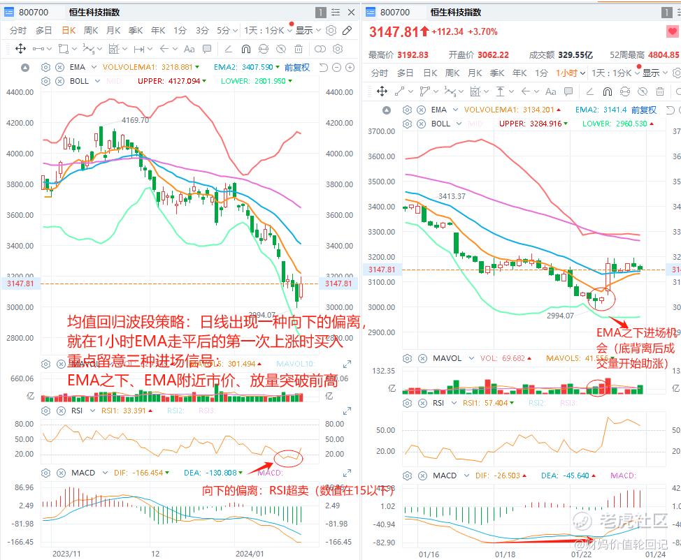 昨天收盘前,因发现 $恒生科技指数 HSTECH.HK$ 出现了等了大半个月的,均值回归波段策略第一种进场信号:EMA之下进场信号,