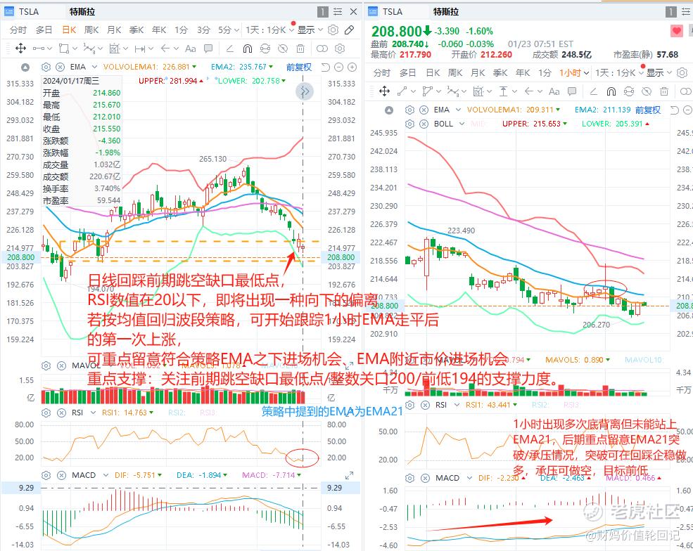 同时右边1小时图可看出,特斯拉一小时出现多次MACD与股价底背离,但未能站上EMA21,后期可重点留意EMA21突破/承压情况,
