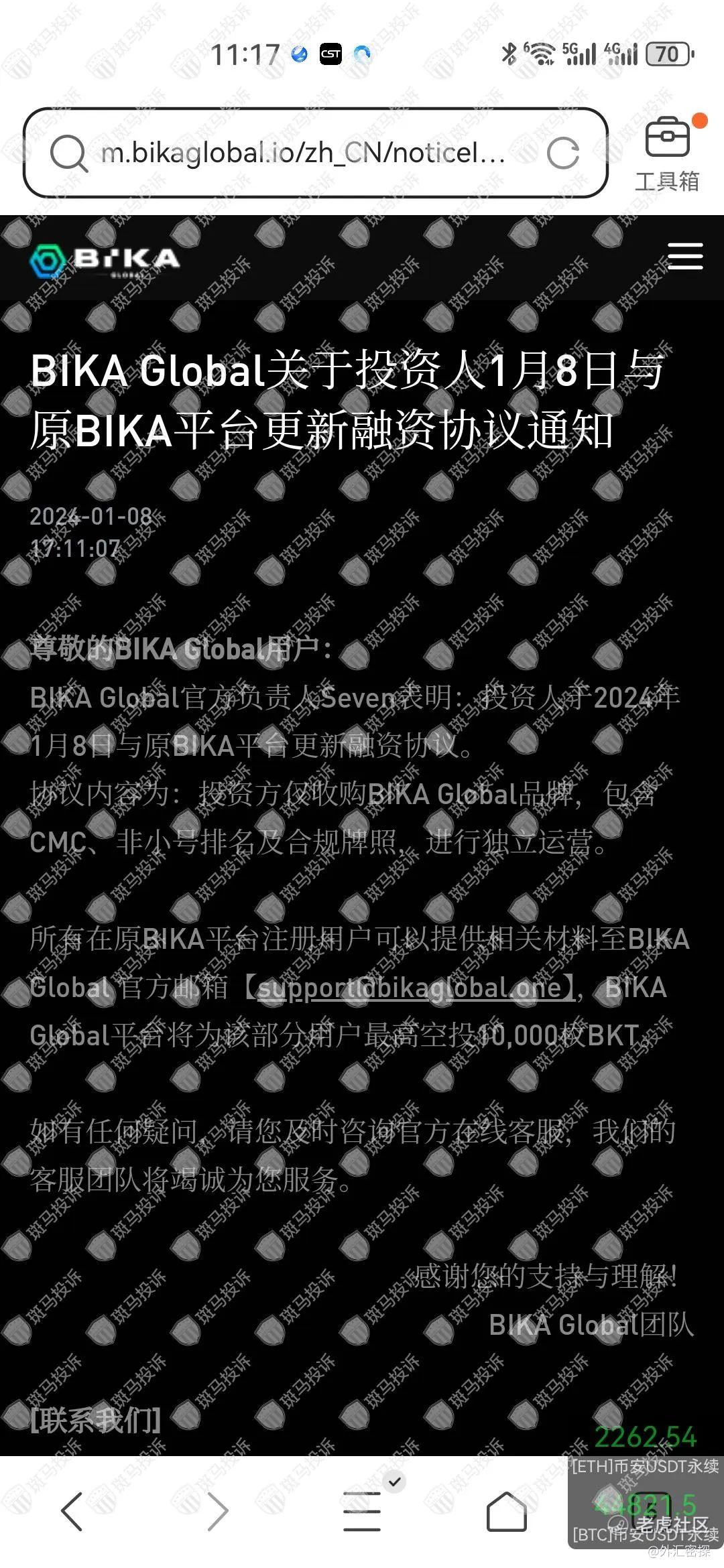 1月8日,BIKA更新与客户的融资(入金)协议,将BIKA原有客户全部转移至BIKA Global,等于转到了一家无监管的离岸公司,投资者的资金更没有安全保障了。