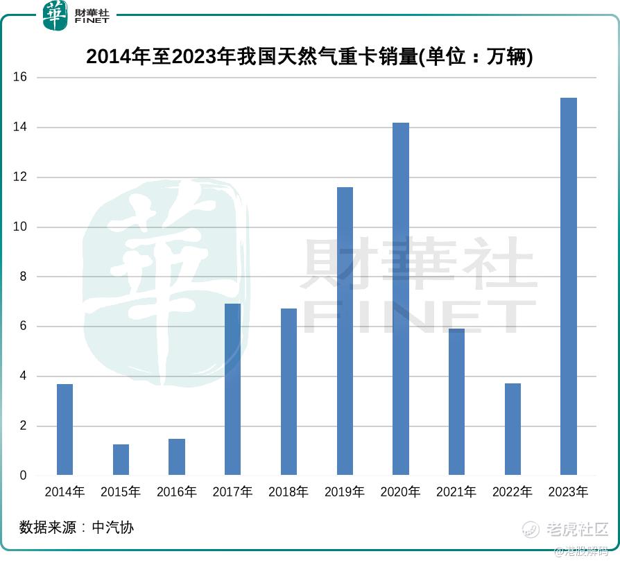中汽协数据显示,2023年天然气重卡累计销售15.2万辆,与2022年的3.7万辆相比,涨幅超过3倍,创下了我国天然气重卡史上的年度销量新纪录。