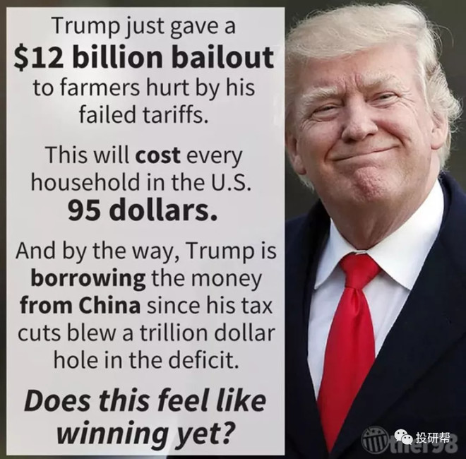 川普要给受关税影响的农民120亿美元补偿,这等于让每个美国家庭从自己口袋里掏出95美金,哦对了,川普花的这些钱还是跟中国借的(中国是美债最大买家),因为他的减税计划把财政亏了个大窟窿,这听起来像是我们已经赢了吗?