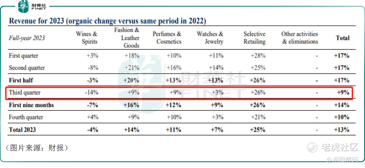 关于葡萄酒和烈酒业务,LVMH表示这是由于在美国和中国遇到困难,这项业务面临着高的比较基础和高库存水平。