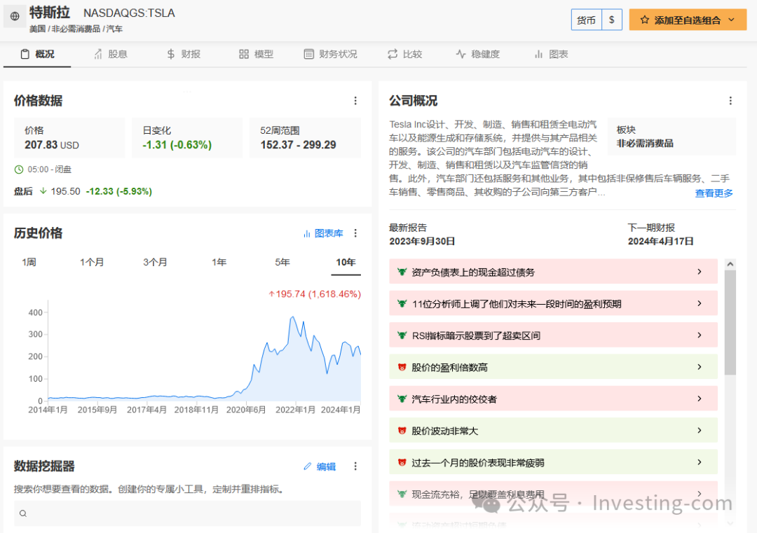 如下图,打开InvestingPro个股概览页面,就可以一眼看到ProTips提供的尽职调查分析,投资者可根据这些信息做出以数据为导向的全面知情决策。