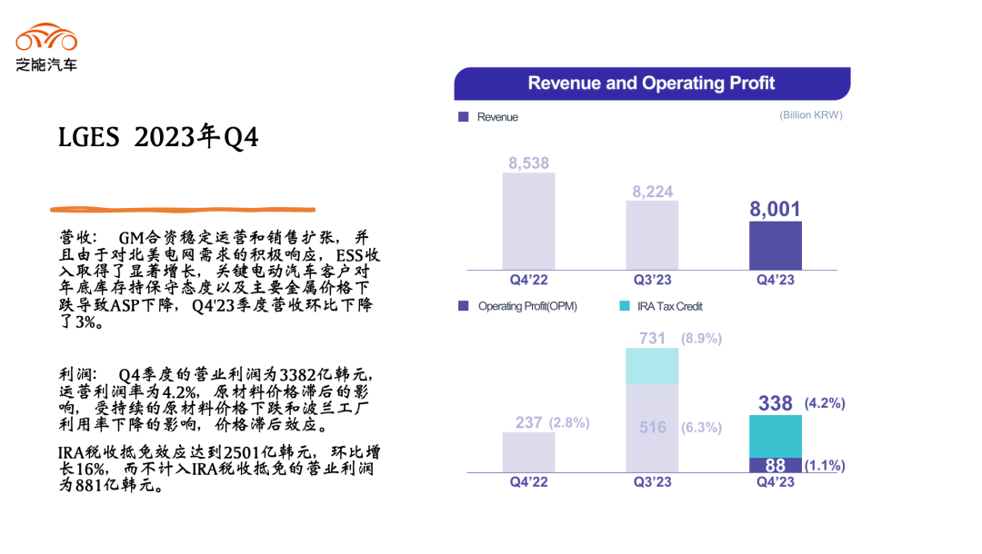 在通用汽车合资企业第一阶段维持稳健运营和扩大销售的同时,由于积极应对北美电网需求,储能领域收入显著增长。由于关键电动汽车客户对年末库存持保守态度以及主要金属价格下跌导致ASP下降,Q4'23季度营收环比下降了3%,同比下降6.3%。