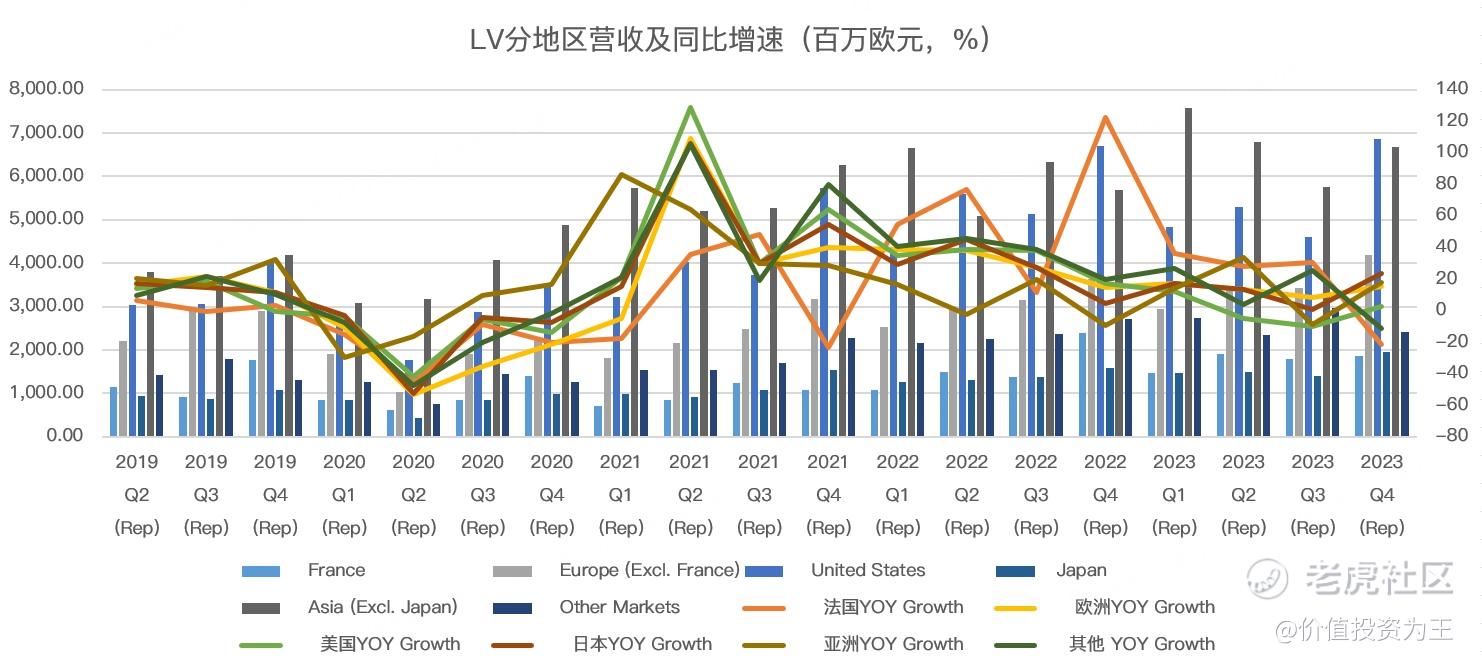 美国作为LV最主要的粮仓,贡献了28.6%的收入,它的企稳回升打消了市场对奢侈品的悲观预期,而中国的复苏不及预期,但得益于2022年四季度的低基数,增速上还过得去。