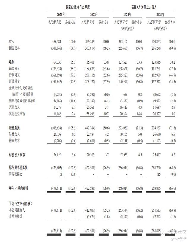 从盈利能力看,太美医疗2021年-2023年度9月30日止,公司实现收入分别为4.66亿元、5.49亿元、4.1亿元,同期,公司年内/期内亏损分别为4.8亿元、4.23亿元、2.69亿元。