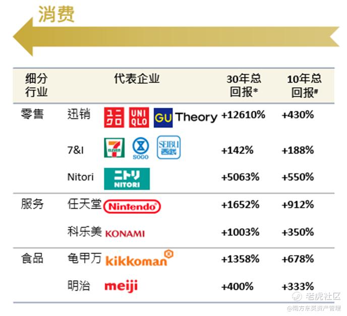 消费领域——日本灵活高效的经营管理全球闻名,令日本零售、食品、服务等消费品牌顺应时势全球化扩张,如优衣库、任天堂等等。