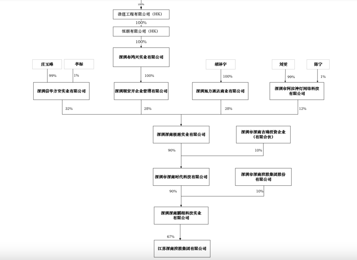 在股权结构上,鹏程实业的控股股东是深圳市深商时代科技有限公司(以下简称“深商时代”),深商时代的控股股东是深圳深商极越实业有限公司(以下简称“深商极越”),而深商极越背后的主要投资人是庄玉峰、罗依迪、胡泽宇、刘雯,他们分别控制深商极越32%、28%、28%、12%的表决权,且不存在关联关系。