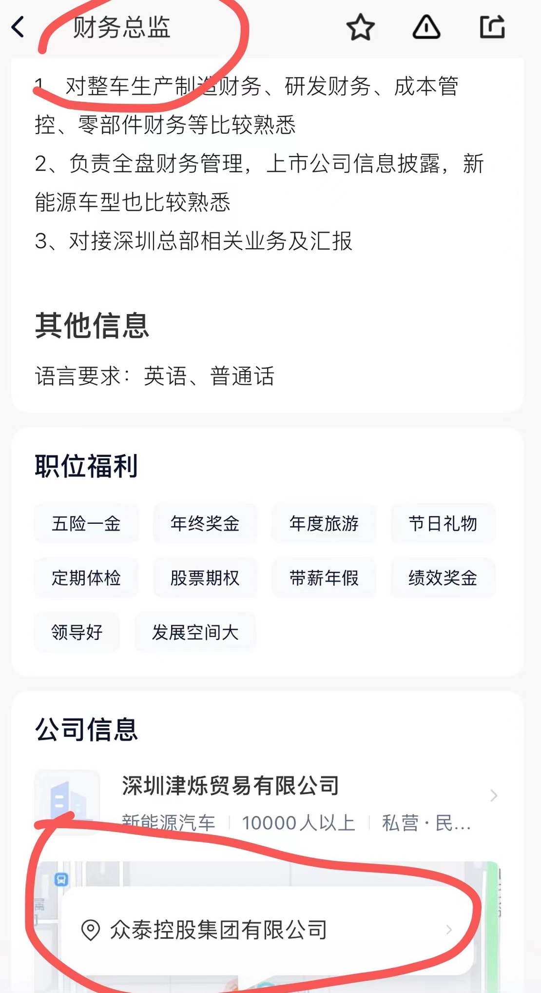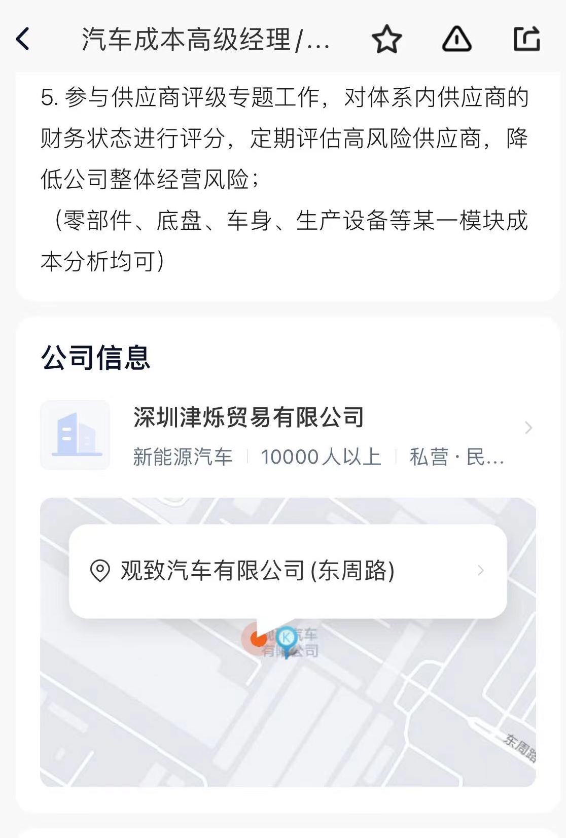 此外,一个“汽车成本高级经理”的岗位页面显示的公司定位为“观致汽车有限公司(东周路)”,观致汽车是宝能集团旗下的汽车品牌之一。