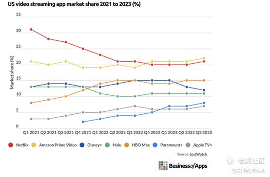 根据美国的应用使用统计数据,Paramount+进入市场较晚,但其市场份额得到了强劲提升。尽管如此,流媒体服务的市场份额只有8%,Netflix和Prime video的市场份额都在20%以上。Paramount+排名第六,苹果+正在积极超越他们。