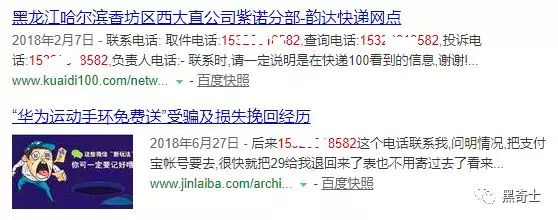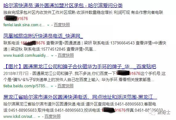 黑奇士在网络投诉帖中看到,不少被骗网友的发货地址为哈尔滨,联系电话的后四位为1676,在网上搜索得知,该号码的使用者是圆通快递哈尔滨市道外区的代理商。