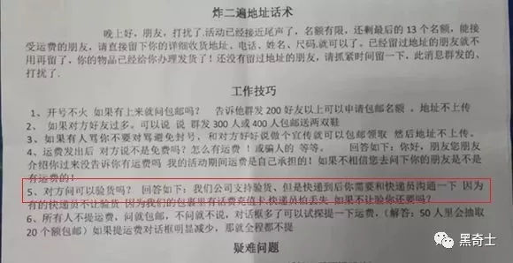 在警方查获的诈骗团伙内部材料上,黑奇士看到,有专门的条款来应付网友“必须先签收才能验货”。而签收后,快递公司会以“已经签收,无法退货”来拖延网友的诉求。