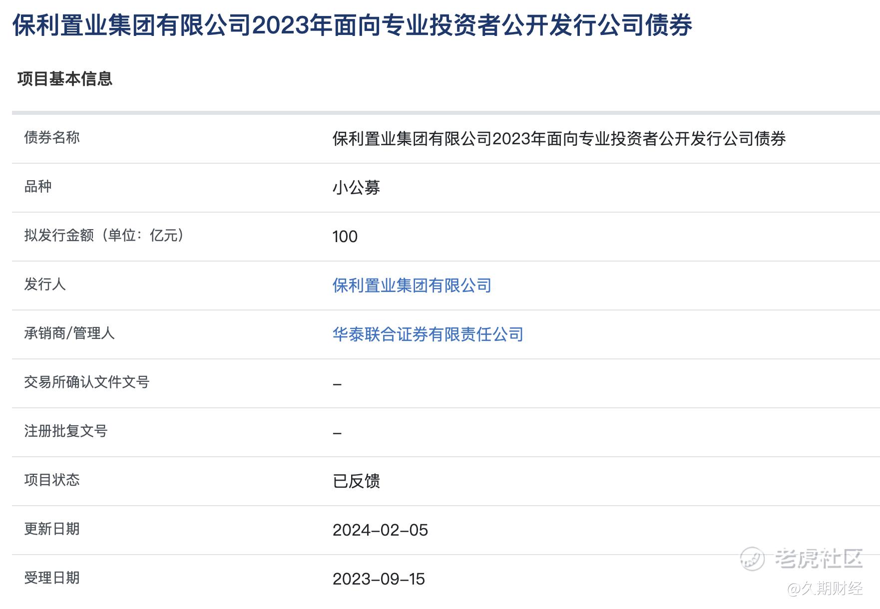 久期财经讯,2月5日,上交所公司债券项目信息平台显示,保利置业集团有限公司(简称“保利置业集团”,00119.HK)人民币100亿元小公募项目项目状态更新至“已反馈”。