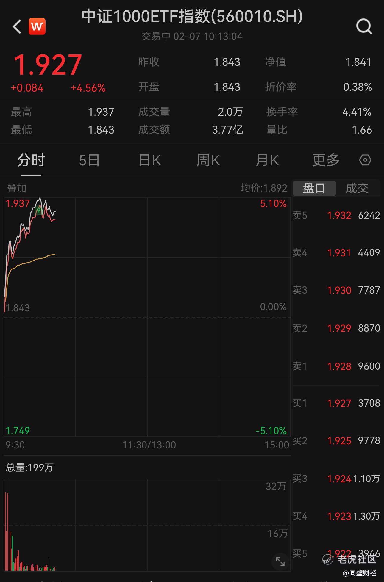 截至10:13,1000ETF指数(560010)早盘迅猛拉升大涨4.56%,连续两天反弹,成交额达3.77亿元,市场交投活跃,成交额持续扩大。