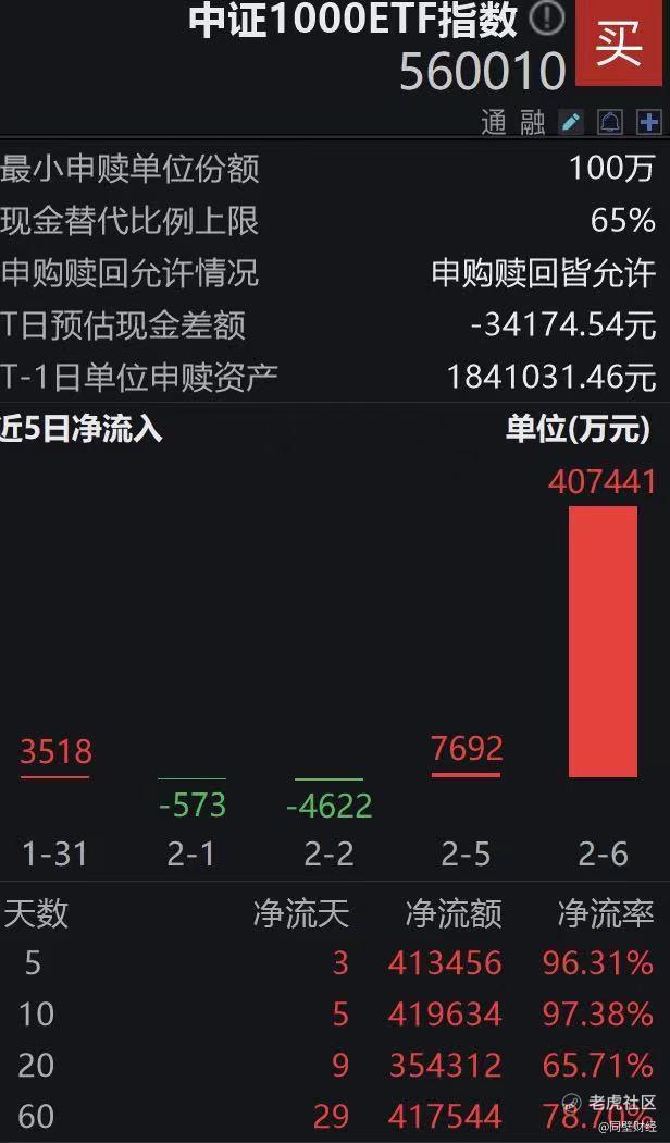 (图片来源:wind) 数据显示,中证1000ETF指数(560010)昨日资金净流入超40亿元,近5日资金净流入超41亿元。