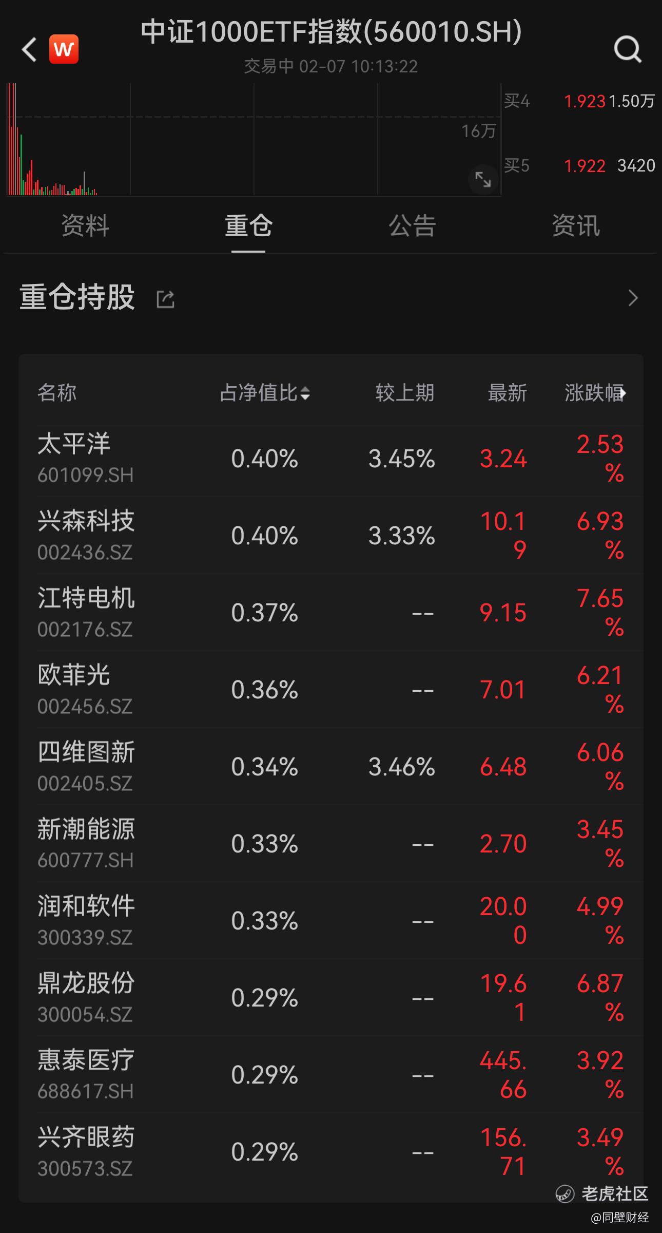 (图片来源:wind,截至2024.2.6) 资料显示,中证1000指数ETF(560010)跟踪中证1000指数。该指数由全部A股中剔除中证800指数成份股后,规模偏小且流动性好的1000只股票组成,综合反映中国A股市场中一批小市值公司的股票价格表现,前十大行业主要集中在新兴成长行业。 截至2024年2月6日,中证1000指数前五大权重股(包括太平洋、神州泰岳、惠泰医疗、新潮能源、欧菲光)占比之和达2.03%,前十大权重股占比之和达3.63%。