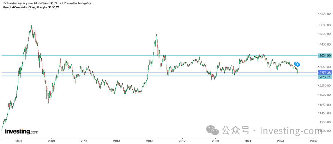 从上面的图表中我们可以看到,小盘股(以罗素2000为代表)自2022年初以来一直处于横盘状态,而中国股市(以上证综指为代表)更是从2015年就开始了横盘走势。