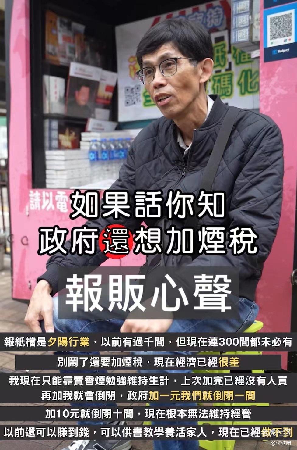 报摊业主的不满主要源于受到固定摊位小贩牌照的规管,仅能售卖除报纸杂志外的12种产品。随着网络时代的兴起,报纸和杂志的销售逐渐下降,而这12种产品中包括一些低利润且需求较低的商品,例如电池和原子笔。因此,售卖烟草成为报摊业主的主要收入来源。过去一次加烟税已经大幅削减了售烟收入,如果政府再次加烟税,报摊业主担心无法维持生计。政府应更全面地考虑政策对各行业的影响,避免导致大量报摊业主失业。