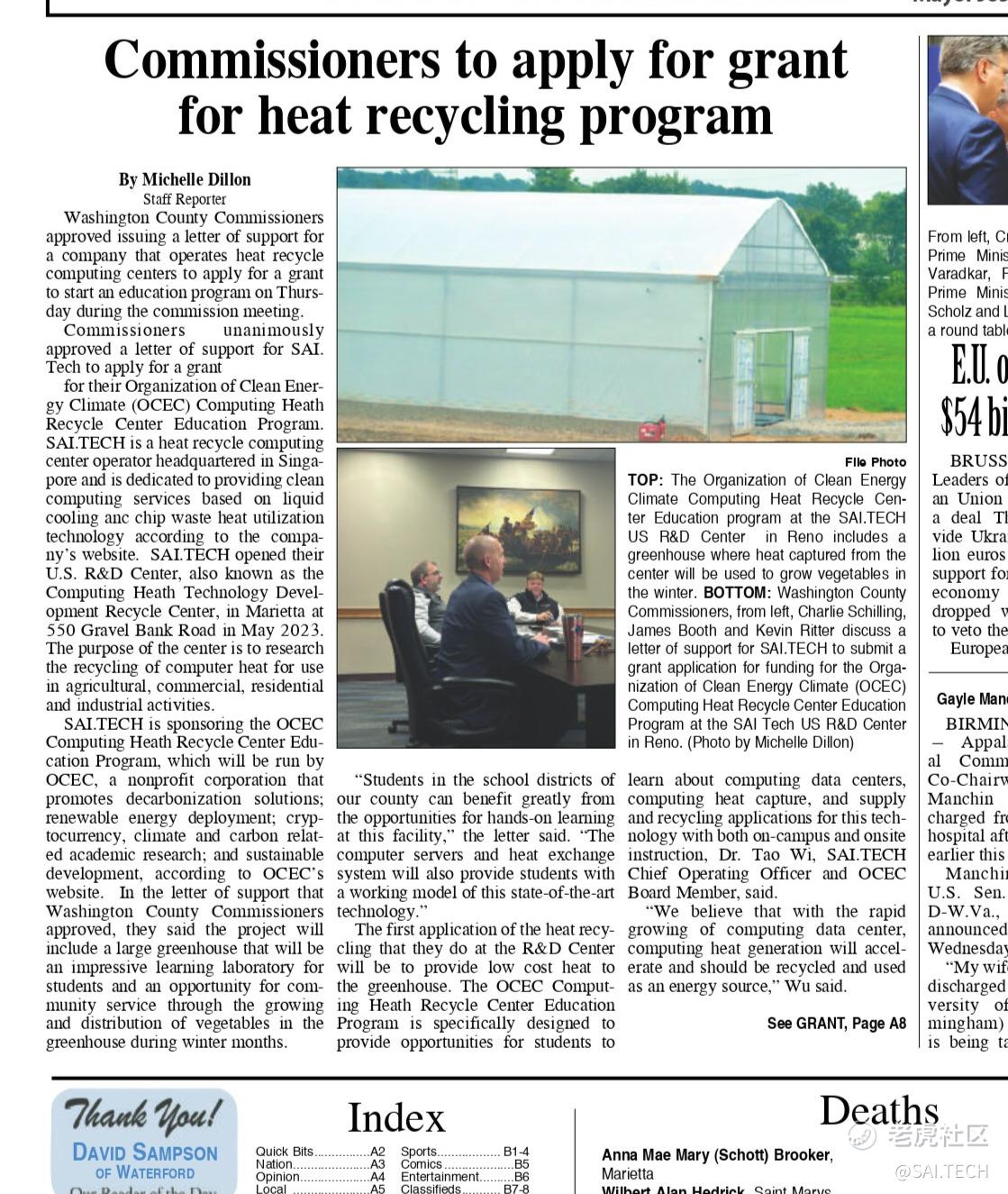 在近期的委员会会议上,华盛顿县的委员们批准并发出一封支持信,支持运营热能回收计算中心的公司SAI.TECH申请的对于清洁能源气候组织(OCEC)计算热能回收中心教育计划”赞助,以开展教育计划。