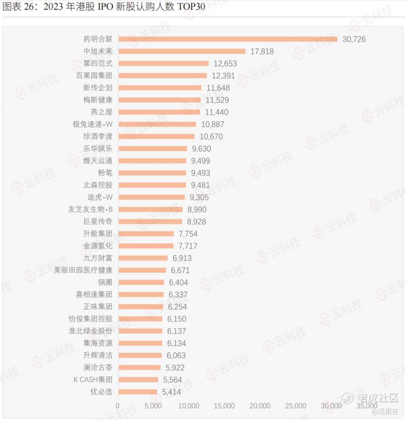 2023年度香港IPO共获400,633人次认购,较去年同期524,158人次下滑23.57%。其中认购人数最多的是药明合联,共有30,726人认购;其次为中旭未来,共有17,818人认购;认购人数最少的是十月稻田,仅1,154人认购。