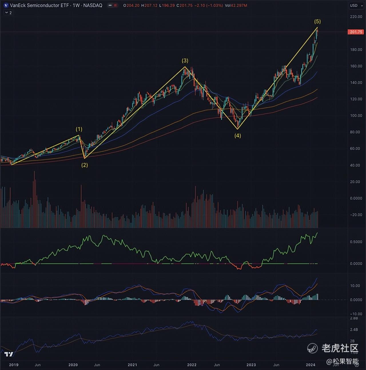 VanEck Semiconductor ETF(SMH)正处于五波脉冲序列的后期阶段,该序列已根据波浪结构成功形成,这表明第五波将在 193 美元至 206 美元的范围内延伸。尽管反弹仍有继续的空间,但有迹象表明健康修正可能即将到来。