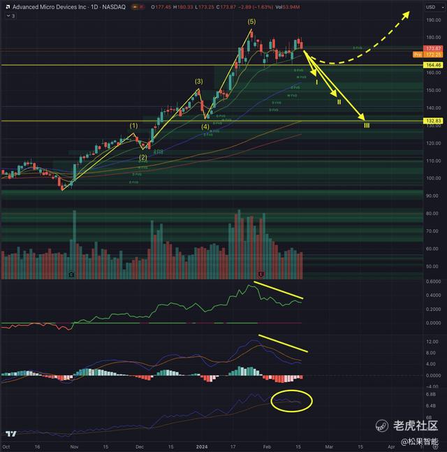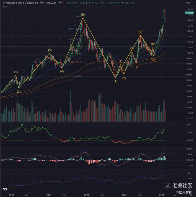 回顾周线图,很明显 AMD 遵循独特的价格走势模式。最初,它形成了五波脉冲序列,最终在 2021 年 11 月达到顶峰。随后,该股经历了三波调整序列,并于 2023 年 10 月结束。此后,AMD 经历了强劲的反弹,其特点是急剧上涨。上升。此次飙升推动该股突破 2021 年 11 月创下的前高点,最终于 2024 年 1 月 25 日创下 184.92 美元的历史新高 [ATH]。