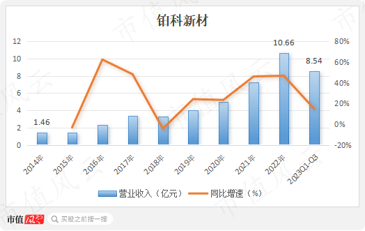 2014-2022年,铂科新材的营业收入从1.46亿元增至10.66亿元,复合增速达28.26%。特别是2019年以来,随着光伏和新能源的兴起,其营收增长明显加快。