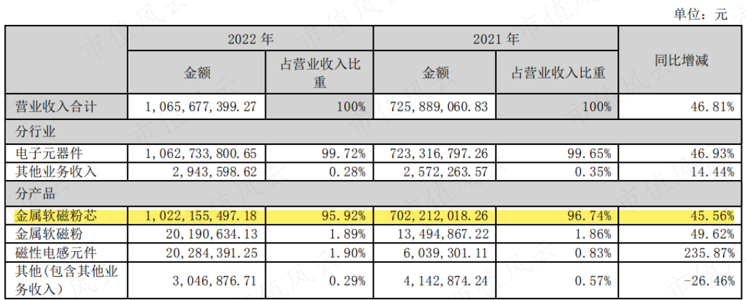 事实上,金属软磁粉芯一直是铂科新材的业绩顶梁柱,2021年、2022年分别创收7.02亿、10.22亿,均占到同期总营收的95%以上。