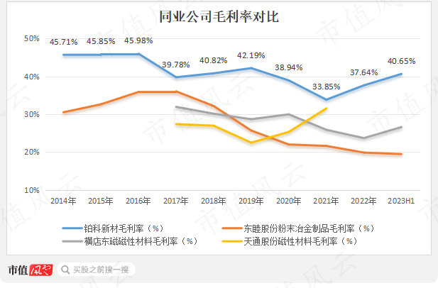 在上述综合作用下,铂科新材的毛利率优势明显,多年基本保持在40%上下,相较同业高出了10个百分点以上。