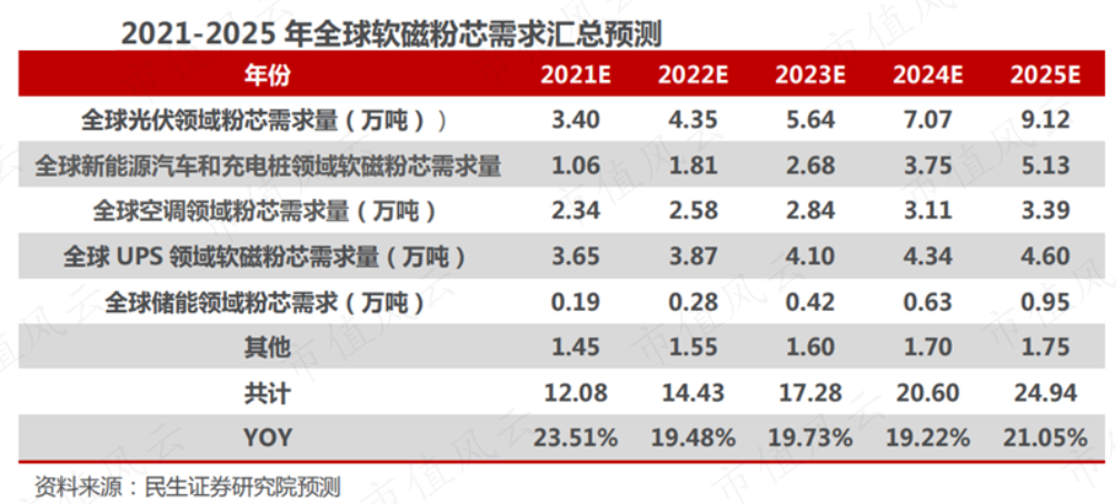 显然,下游领域都是个顶个的时代顶流,合金软磁粉芯的市场前景也就无需多言。据券商测算,2021-2025年,全球软磁粉芯的需求量将从12.08万吨增长至24.94万吨,复合增速为19.87%。