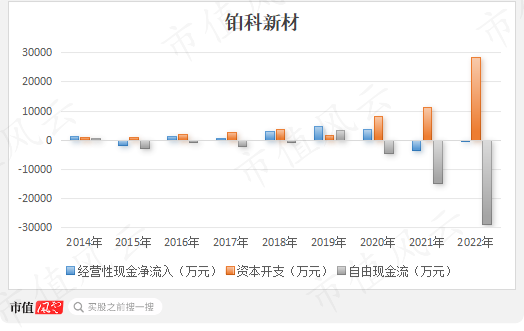 然而,铂科新材的这些利润却并没有如期以现金形式收回,2014-2022年靠着经营活动共赚得现金8,111万。