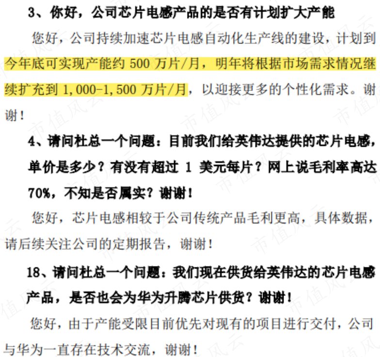 目前,铂科新材的芯片电感,取得了多家国际知名芯片厂商的验证和认可,并已经开始为英伟达初步供货,同时这也是公司最近在机构调研时被频繁关注的一点。