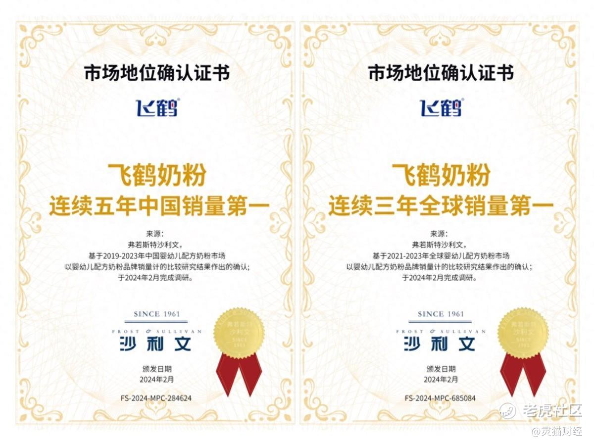 近日,国际权威调研机构弗若斯特沙利文,向飞鹤颁发多项“第一”认证证书。认证信息显示,2019年-2023年度,飞鹤奶粉在中国婴幼儿配方奶粉市场(不含港澳台地区)连续5年位居第一,在全球婴幼儿配方奶粉市场连续3年销量第一。同时,旗下星飞帆系列早已成为婴儿奶粉品类全球第一大单品。