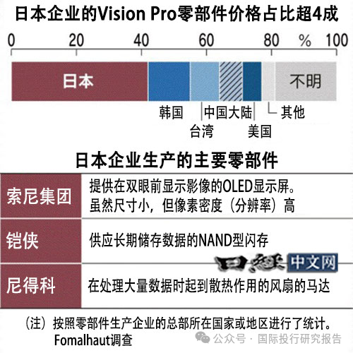 据在日本调查公司Fomalhaut Techno Solutions的拆解,在美国苹果2月推出的眼镜型终端“Vision Pro”使用的零部件中,按价格计算,日本第一,42%由日本企业供应。采用了索尼集团的显示屏和铠侠(Kioxia)的存储器,