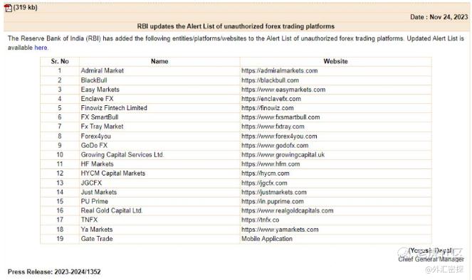 为了证实其立场坚硬,印度储备银行(RBI)于2023年11月更新了有关“非法”外汇交易平台的警告清单,其中包括Easy Markets、Admiral Markets和HF Markets等许多受欢迎的国际品牌,标记名称总数达到75个。