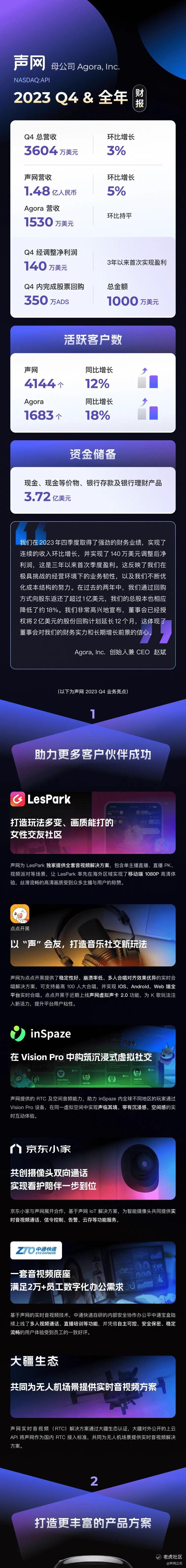 在客户规模方面,截至2023年12月31日,声网活跃客户数量达4144个,同比增长12%,Agora活跃客户数量达1683个,同比增长18%。