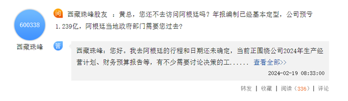 两个月前,西藏珠峰曾透露公司董事长黄建荣计划前往阿根廷,拜访有关政府部门,调研项目进展。但近日,其又在投资者平台称行程尚未确定。