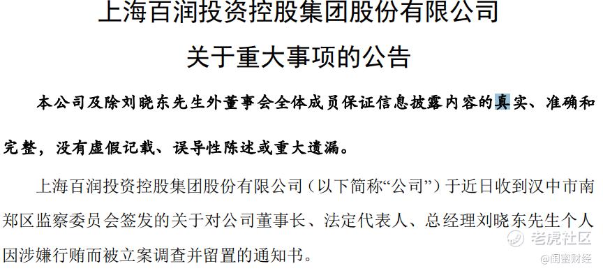 据百润股份2月27披露的公告:该司于近日收到汉中市南郑区监察委员会签发的关于对公司董事长、法定代表人、总经理刘晓东先生个人因涉嫌行贿而被立案调查并留置的通知书。