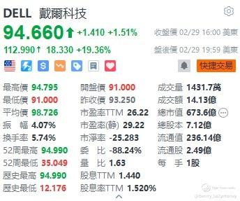 早前,笔者介绍的戴尔电脑$戴尔(DELL)$ (DELL)出业绩了,Q4营收为223亿美元,同比下降11%,略高于市场预期的222亿美元;不计部分项目的每股收益为2.20美元,同比增长22%,好于市场预期的1.72美元。