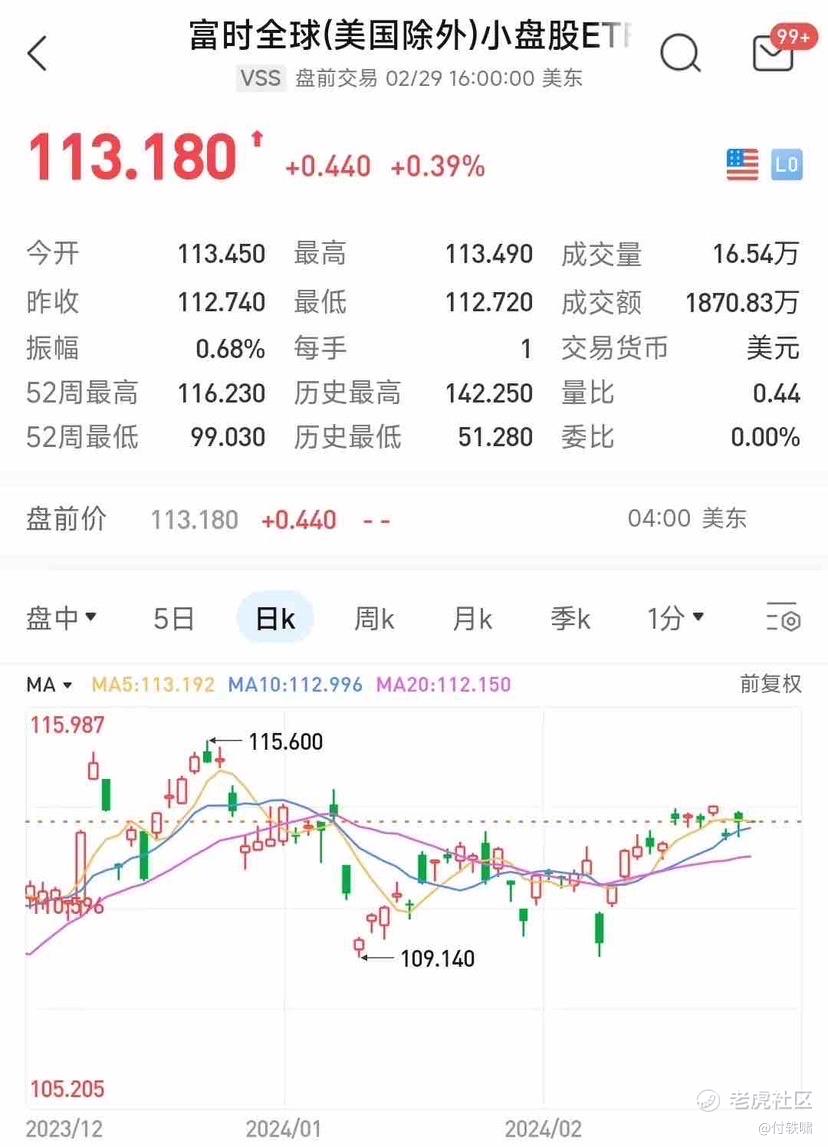 总之,富时全球小盘股ETF-Vanguard(VSS)作为一个专注于全球小盘股投资的ETF产品,具备一定的投资价值和潜力。投资者在配置时需要结合基本面和技术面进行综合分析,以制定合理的投资策略。$VANGUARD INTL EQUITY INDEX FUND INC FTSE ALL-WORLD EX USA SMALL CAP ETF(VSS)$
