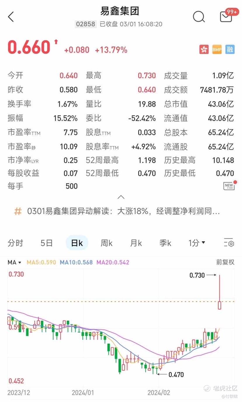 随着易鑫集团(02858.HK)近日发布的2023年度业绩报告,该公司的股价应声上涨,涨幅高达13.79%,现报价0.66港元,这一市场表现不仅反映了投资者对易鑫集团业绩的认可,也预示着其在汽车金融领域的广阔前景。