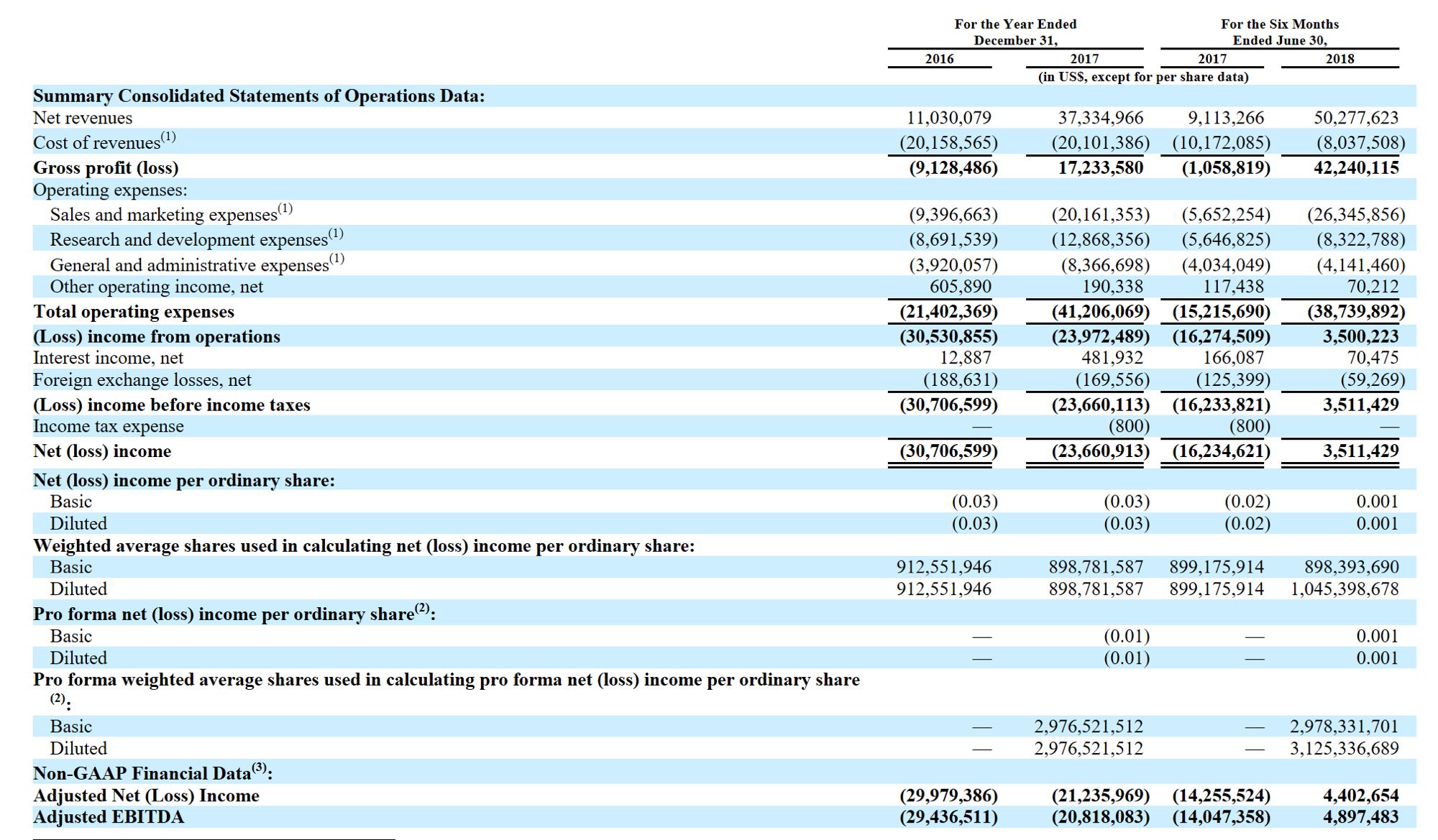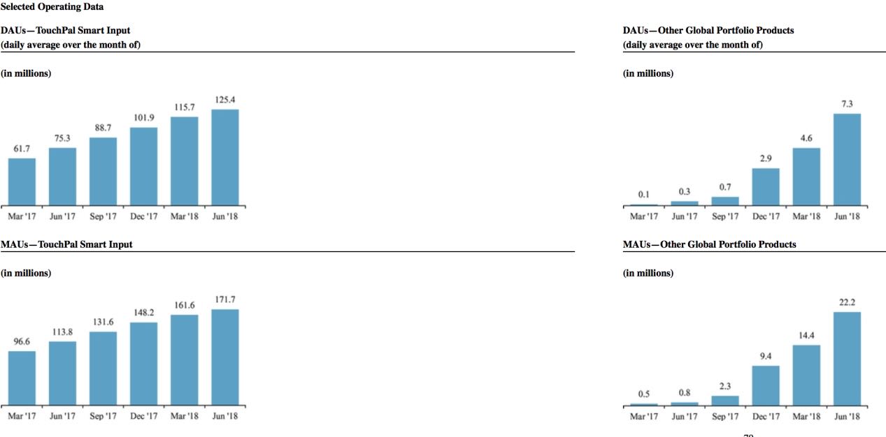 触宝是近期除互金外少有的互联网盈利上市企业,主要通过移动广告产生收入。招股书显示,触宝2016年营收为1103万美元,2017年营收为3733万美元。2018年上半年营收5027万美元,2017年同期为911万美元,同比增长453%,增长势头迅猛。从招股书上看,触宝全球产品组合的平均DAU从2017年6月的7560万增加至2018年6月的1.326亿,同比增长75.3%。随着触宝对产品和服务的持续创新,用户体验的不断改进,触宝将继续扩大全球用户群,提高用户对产品的参与度,预计触宝的广告收入在未来将增长更快。